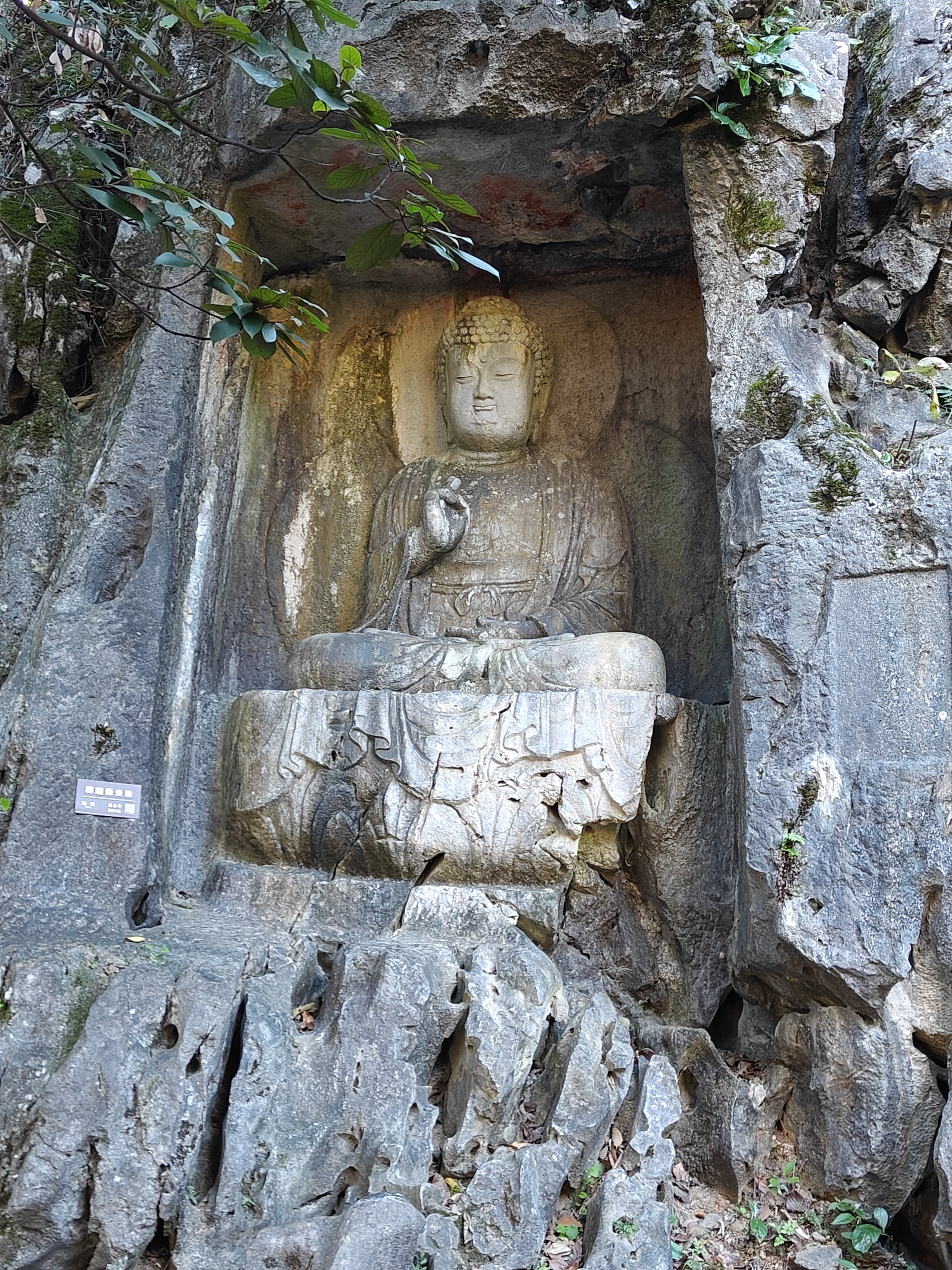 造像面相方正,高眉细目,眉间有毫相,双耳垂肩,颈部三道蚕纹,螺发,低平肉髻,身着双领下垂式袈裟,胸口裸露,下身穿裙,腹部系带。右手当胸,拇指与无名指相捻,结说法印,左手于腹前结定印。结跏趺坐于仰莲台,袈裟呈三瓣状垂于台座前。身后有头光和身光,均为圆形素面阳刻,头光叠压于身光之上。汉传佛教佛螺发,配有低平肉髻,双耳垂肩,耳垂宽大,高眉细目,眉间有毫相,符合释迦牟尼佛的传统形象。身着双领下垂式袈裟,衣缘细致,身着双领下垂式袈裟,衣缘细致,展现出元代工匠的高超技艺。